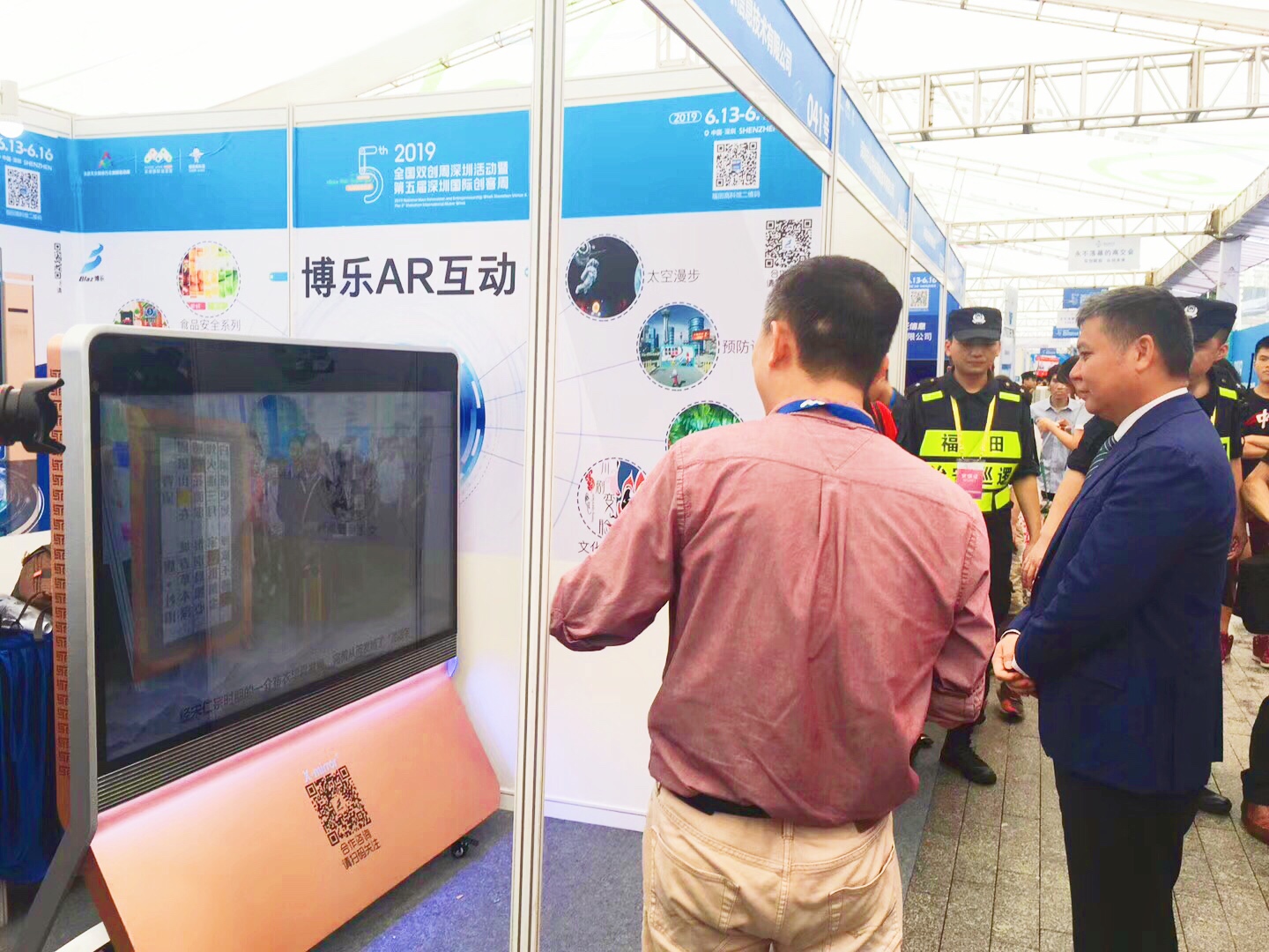 今日非常荣幸博乐AR互动能够为王立新副市长一行人做演示体验,未来博乐信息将再接再励,坚持AR互动内容生态建设,为更多行业带来AR领域的解决方案。华强北步行街双创活动福田高科馆体验中心,我们在41-42号展位期待您的到来。双创活动结束后,博乐AR将精彩延续,在深业上城福田高科馆继续为大家带来精彩的AR互动体验。