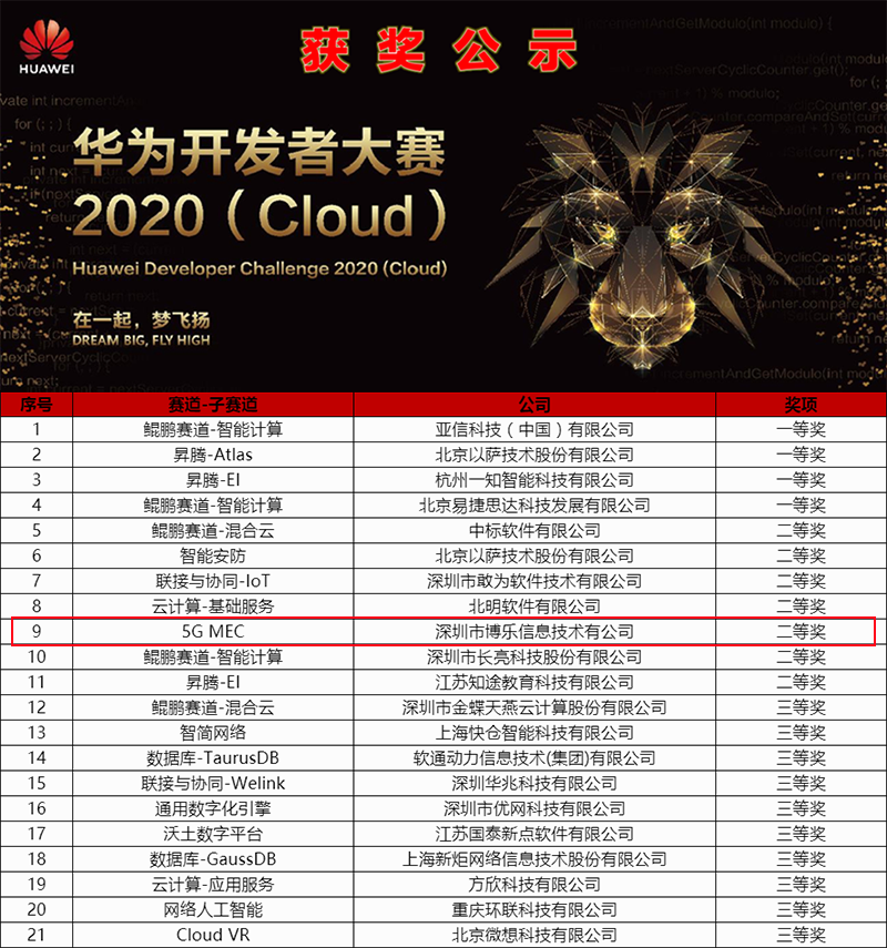 2020年3月9日,华为开发者大赛2020(Cloud)受疫情影响以线上直播方式举办,作为ISV组5G MEC赛道唯一入选企业,经过激烈的演讲、评审,博乐信息“5G MEC+AR互动+AI广告”解决方案荣获ISV组二等奖。未来博乐信息将联合华为,共同推进5G生态高速发展,使能千行百业。