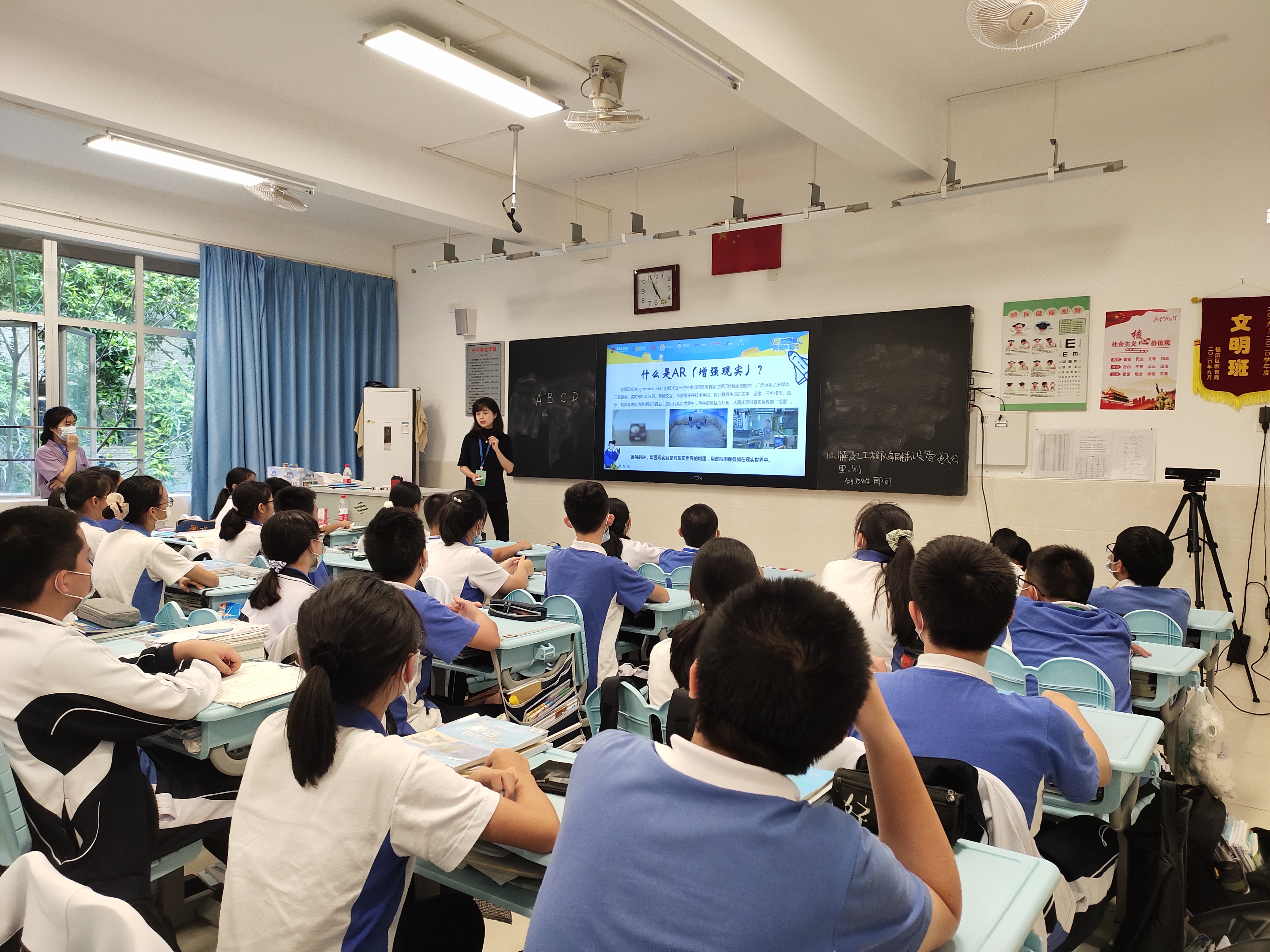 10月9日,校园科普行第二站走进梅山中学初二一班教室,在同一个教室体验完全不同的AR文化科普体验课,感受科技之光,体验文化之魅力。雄伟壮观的《大报恩寺琉璃塔拱门》、世界第八大奇迹《兵马俑》,带领同学们体验“活”起来的国宝。