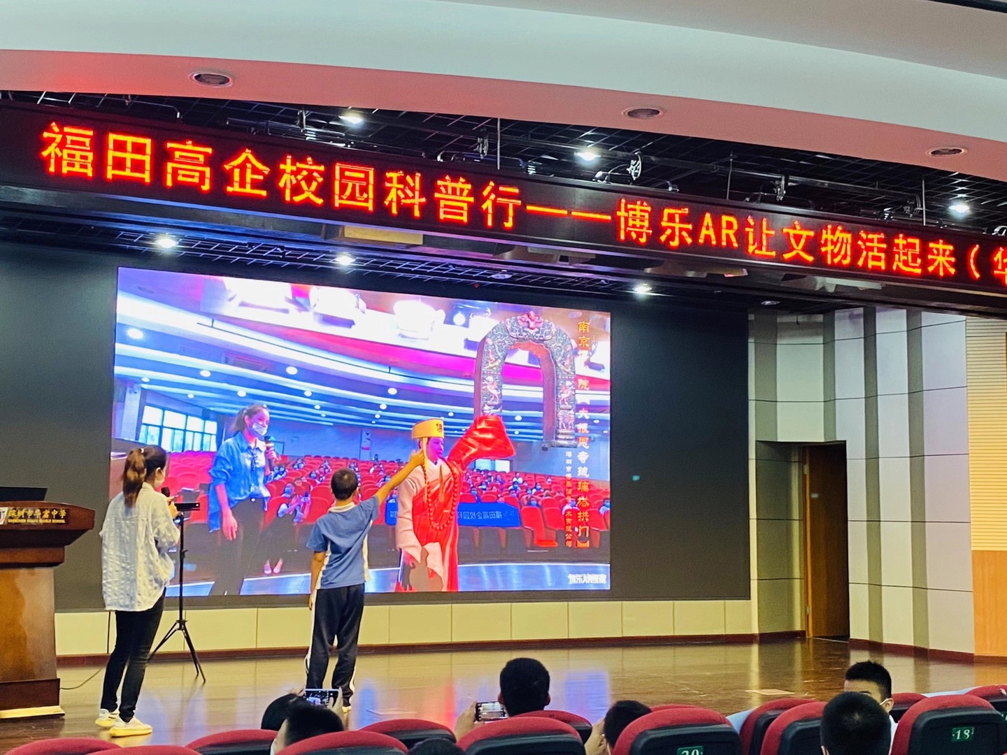 9月27日,校园科普行第一站在华富中学大礼堂拉开帷幕,课程结合AR增强现实技术普及和全国博物馆镇馆之宝文物的现场体验,体验环节吸引了同学们的参与热情,栩栩如生的《千里江山图》把同学们带到遥远的故宫,变身宋徽宗游览大宋的美好江山。