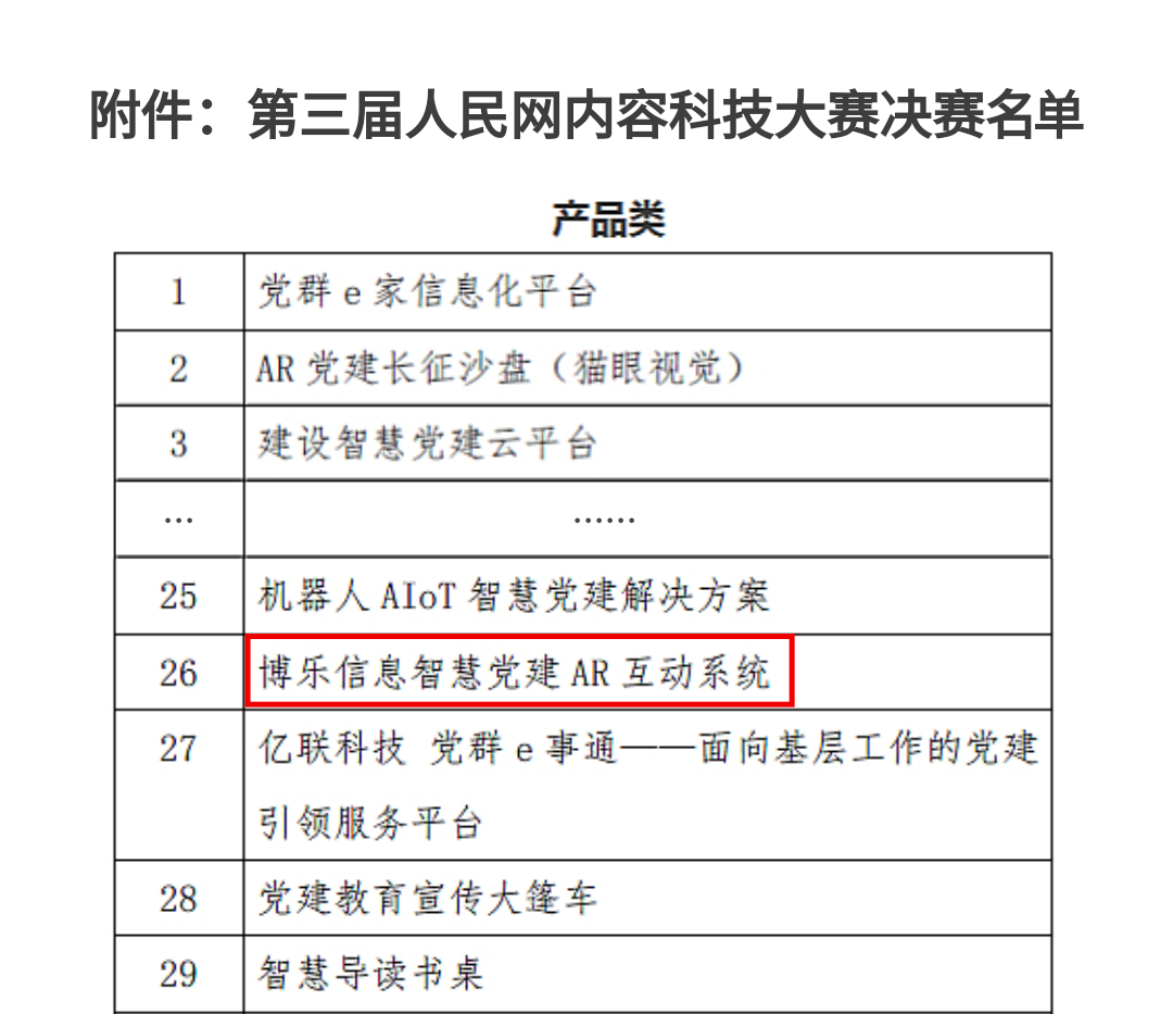 2021年第三届人民网内容科技大赛聚焦“智慧党建”方向,为新一代信息技术在党建工作的运用探索新的道路与空间,本次全国累计征集智慧党建产品120个。博乐信息智慧党建AR互动系统以其新颖性、实用性、可推广性入选决赛,并受邀入驻人民网智慧党建体验中心。