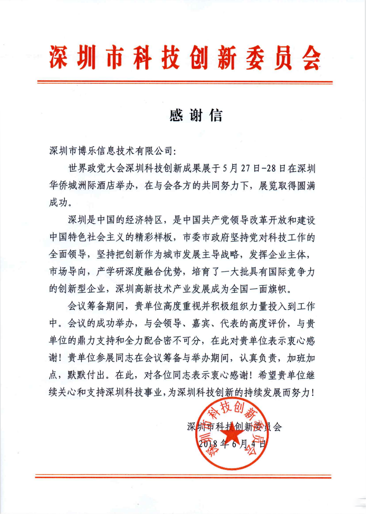 在会议展区现场,憨厚可爱的国宝熊猫、世界第八大奇迹兵马俑、川剧表演特技之川剧变脸等中国优秀传统文化互动,吸引了众多海内外政党嘉宾、媒体的互动体验彰显中国“科技+文化”魅力,展示大国文化软实力的非凡成就。会后,博乐信息也收到深圳市科创委发来的感谢信。
