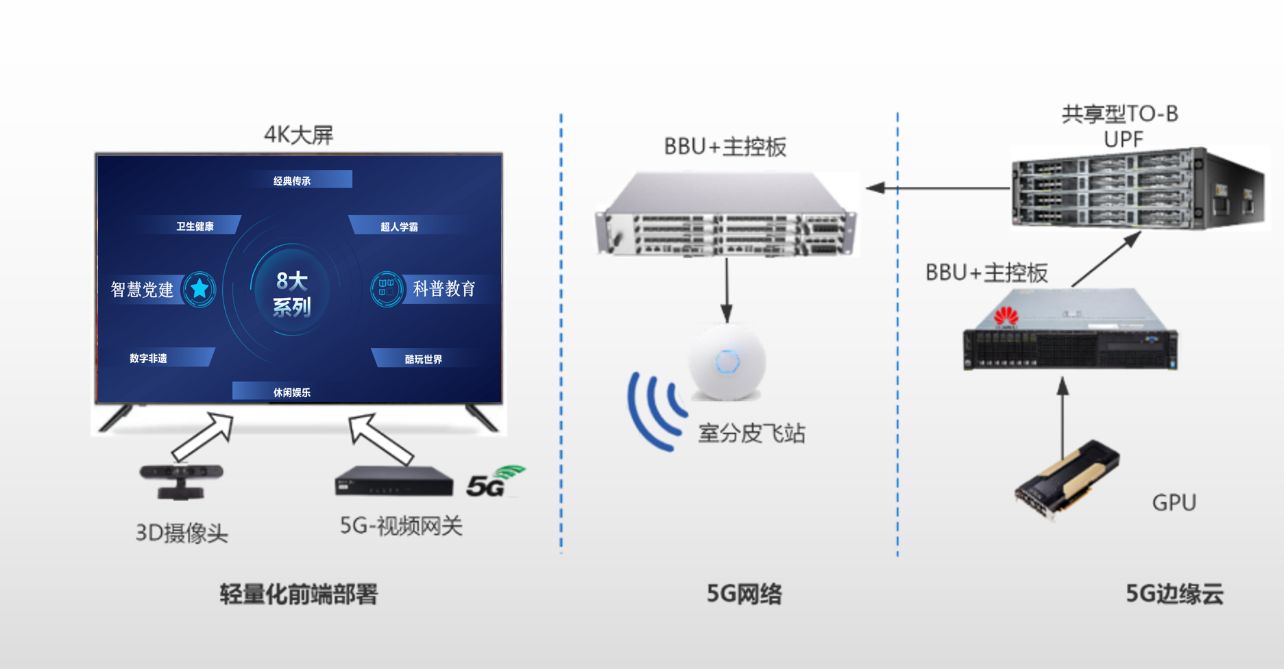 基于5G-MEC边缘计算的前端轻量化AR系统解决方案以科普教育、数字非遗、经典传承、智慧党建、超人学霸、卫生健康、休闲娱乐、酷玩世界等8大主题系列内容为核心,基于5G网络低时延、大带宽的特性创意研发。结合虚拟增强现实AR技术,打造8大主题应用解决方案,包含了轻量化前端硬件、(5G)网络+(边缘)云、多系列互动系统(软件)三大部分。