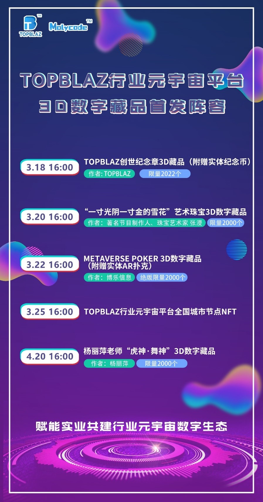 2022 年3月15日下午4时,TOPBLAZ行业元宇宙平台暨魔力元码Molycode产品发布会线上召开,会上发布了打造现实世界通往元宇宙新世界的诺亚方舟和入场券的新产品魔力元码Molycode。