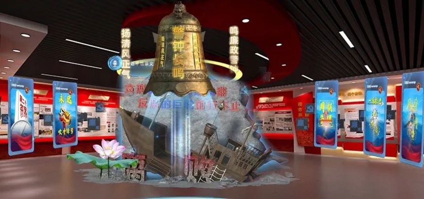 在红船殿堂中,通过触碰场景数字内容,体验“老虎苍蝇一起打”“敲响警钟”等数字交互内容,在互动中树立“抵御诱惑,干净做事,干净做人”的精神特质。