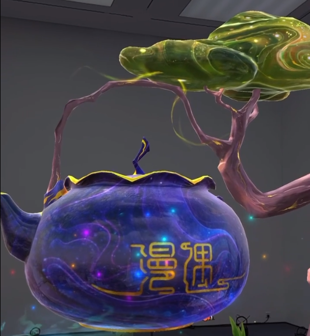 在漫遇元宇宙珠宝科技展上,以“珠宝开壶了”为主题通过元宇宙混合现实技术应用,将著名节目主持人、制作人张漫老师跨界创新设计的30多件时尚艺术珠宝作品,放置于30把百年悠久的铁壶中,掀开壶盖即可感受岁月沉淀与艺术珠宝的双重文化魅力。