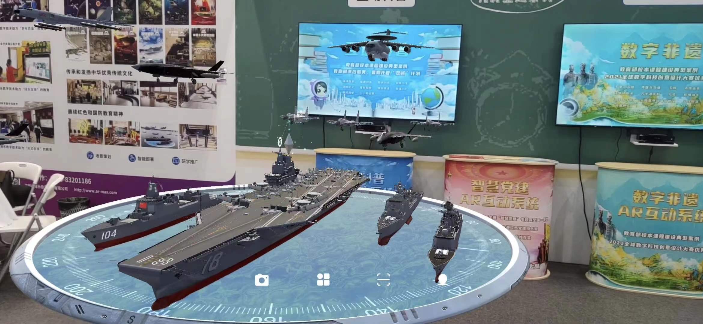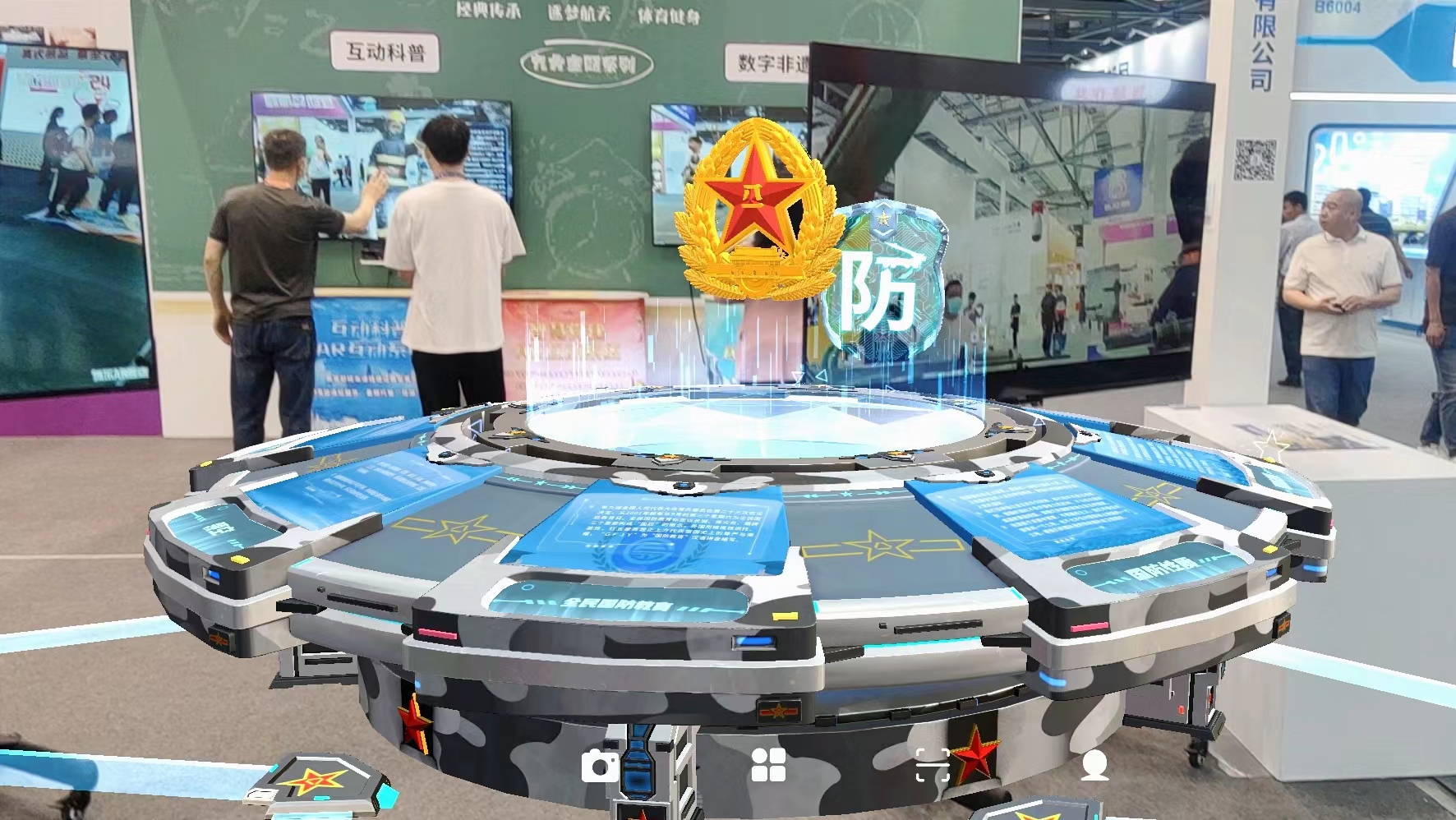 值得一提的是,这样的场景在展会现场的现实空间中并不存在,到场的观众是通过佩戴智能眼镜和使用手机、平板电脑扫描博乐信息展位空间,才可以看到的“国防教育系列-铸盾强防”元宇宙数字空间所带来的别开生面的视觉画面和趣味体验。
