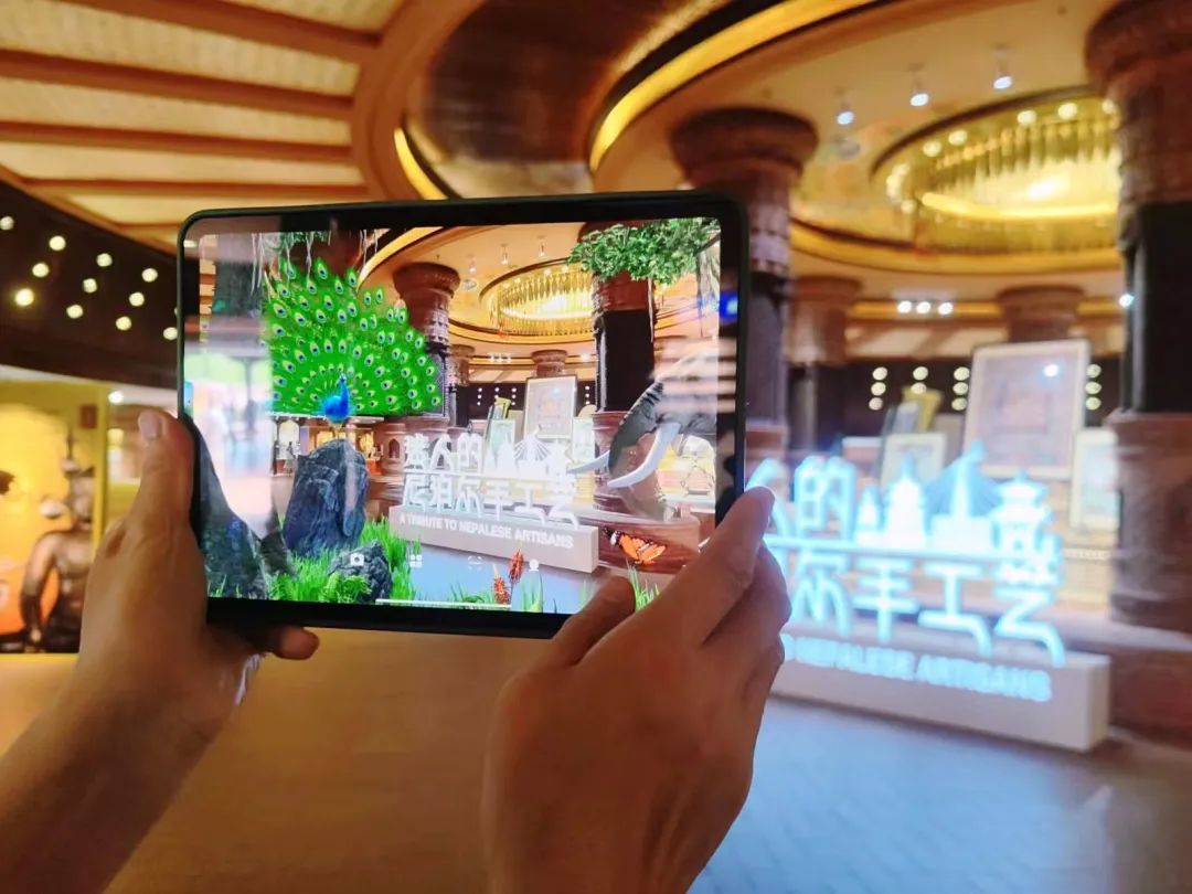 MR视觉体验区,观众拿起手机或戴上智能眼镜,眼前的非遗博物馆便将华丽变身。