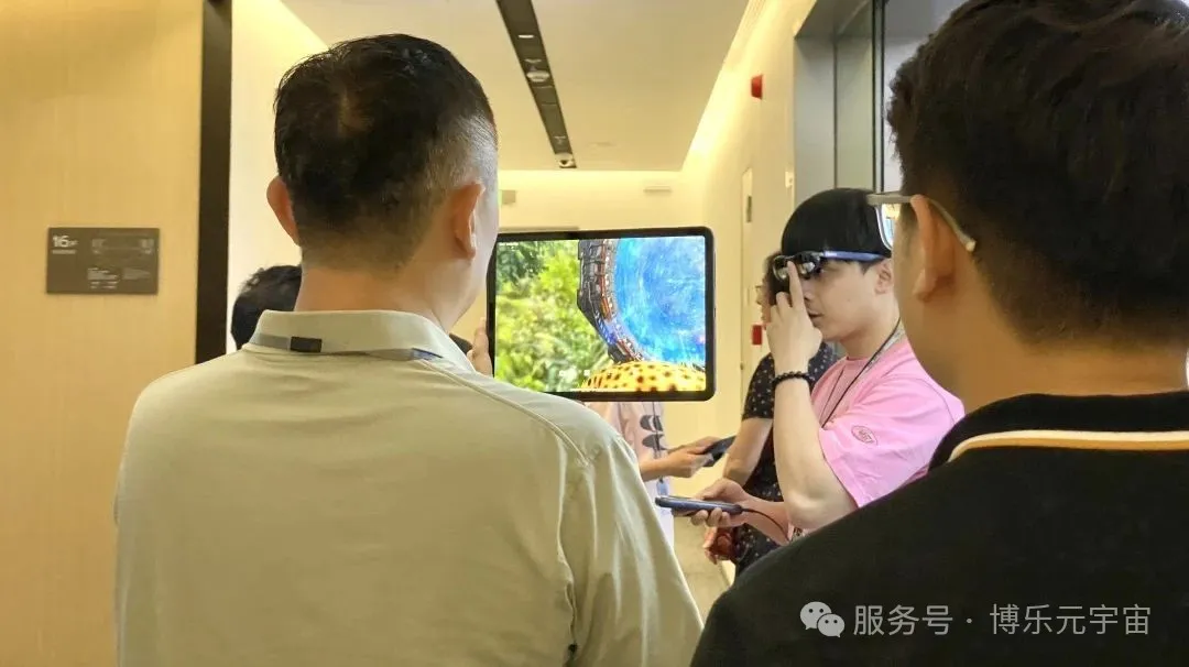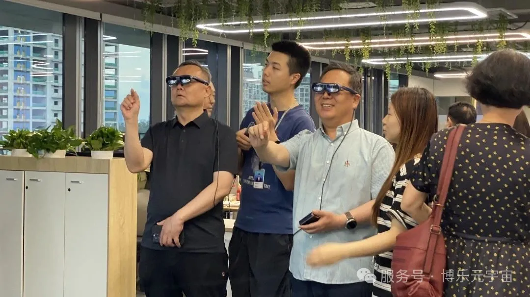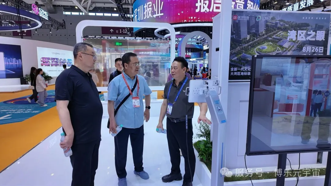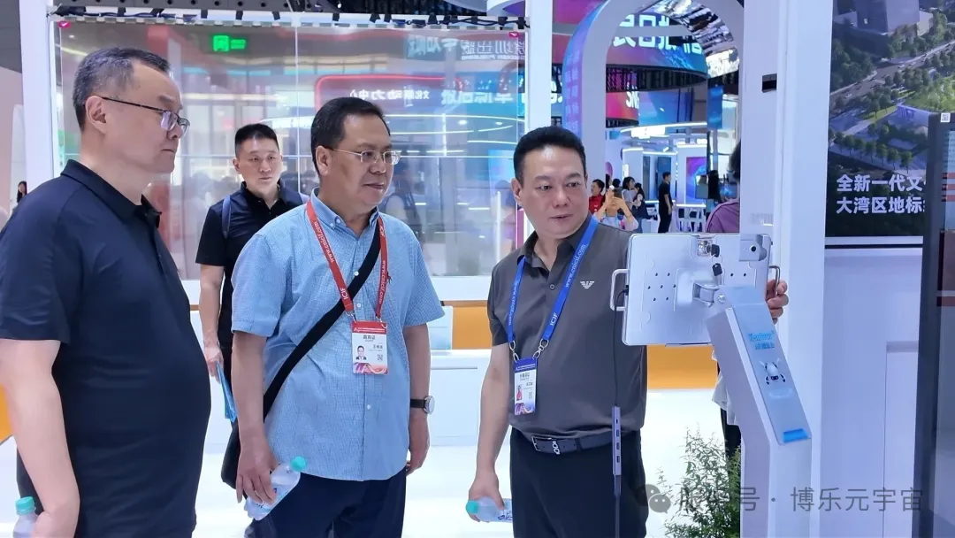 5 月 22 日,深圳博乐信息技术有限公司携 AI+XR 数字交互全场景解决方案重磅亮相 14 号馆,展会期间,王会长与庞董事长一行专程到访博乐展位,体验 X-mirror 全息视界、AI 绘梦绘本、MR 视觉交互打卡点及 AR 魔法台等创新产品。