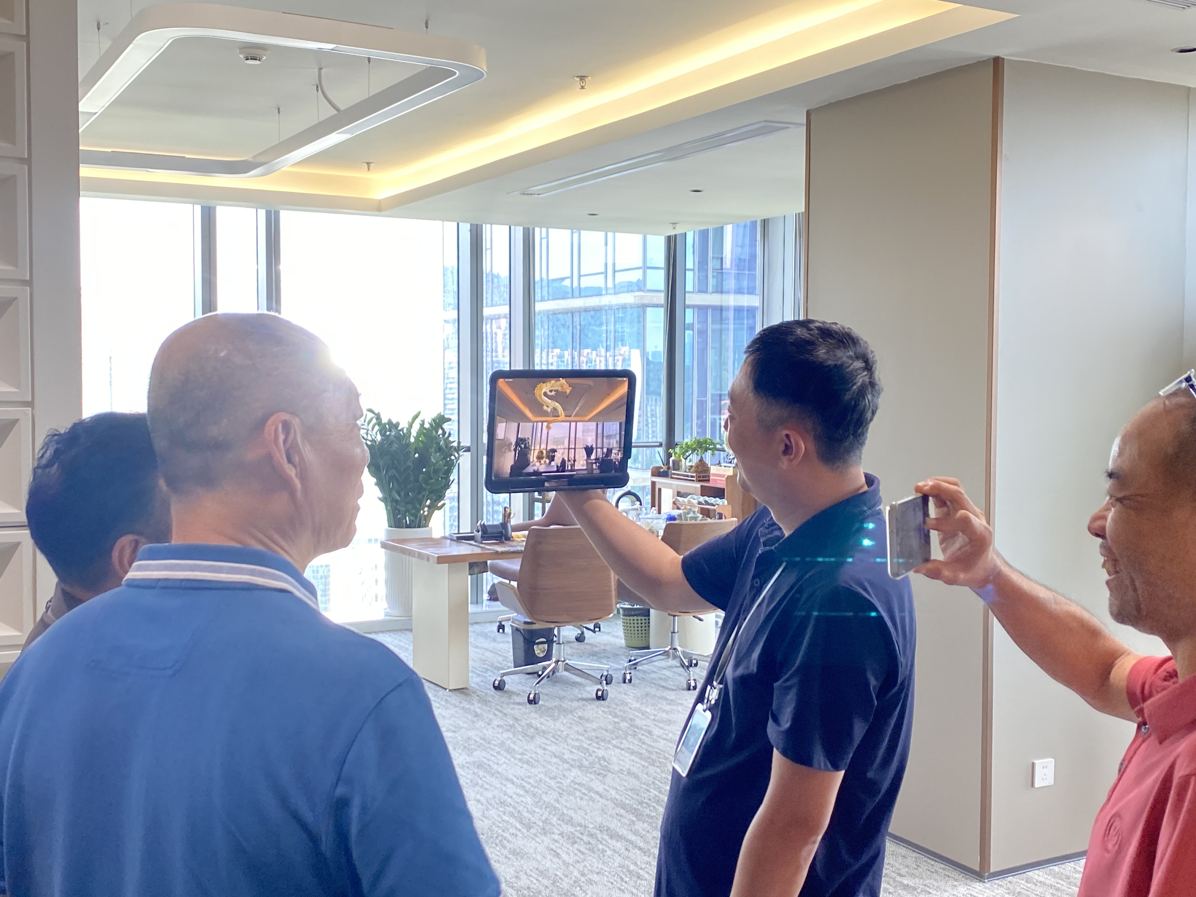 5月 27 日,深圳市建设项目管理协会会长赵绪来、香港办事处执行会长黄日升、沙特阿拉伯办事处主任吴中荣一行到访博乐信息,深度考察AI+XR数字交互技术在文化传播与品牌全球化中的应用。