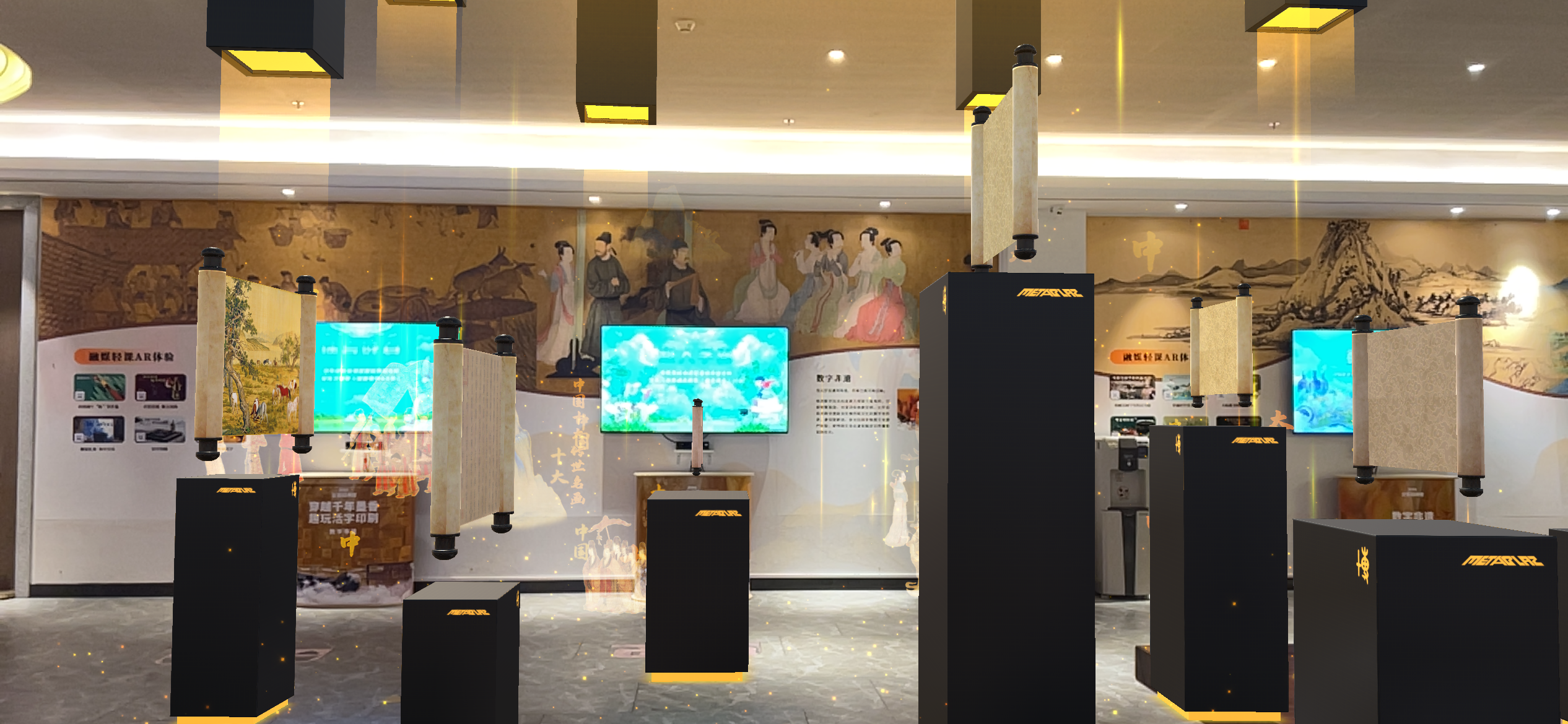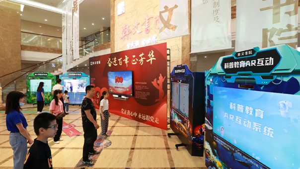AR大屏互动区:搭载智慧党建等内容,学生无需穿戴设备,通过手势即可进行AR宣誓、党史学习等互动,让思政教育与科普知识以高互动、轻量化的方式融入教学。