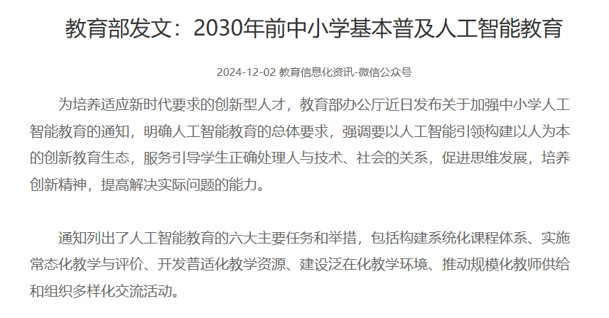 教育部“2030年前普及AI教育”的目标发布后,各地学校迅速响应:硬件采购、课程引入、教师培训相继展开。然而,从实际推进情况来看,一个普遍问题逐渐浮出水面——设备到位了,课程开起来了,但学生的AI素养并未同步提升。