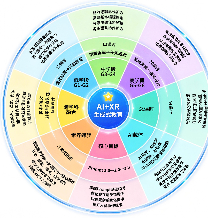 高年段(G5-G6):系统集成,面对开放性问题拆解任务、分步设计指令、整合多轮结果,完成从构思到XR空间的完整创作